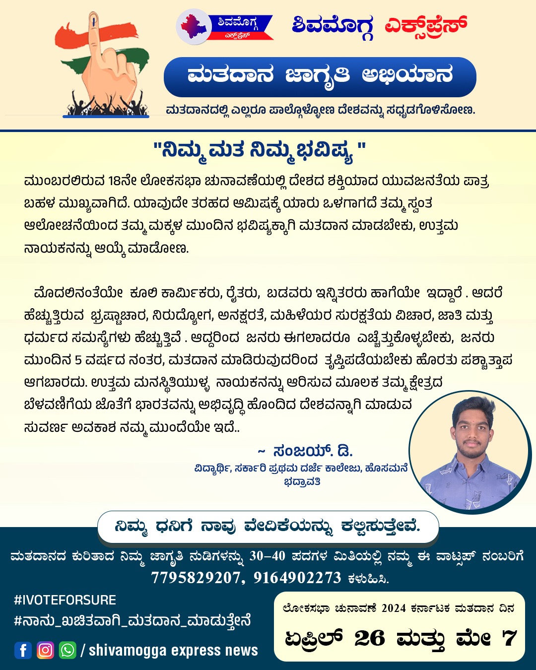 ಮಲೆನಾಡಿನ ಶೈಕ್ಷಣಿಕ, ಮನೋರಂಜನೆ, ಅಪರಾಧ, ಅಪಘಾತ ಮತ್ತು ರಾಜಕೀಯದ ಕ್ಷಣ ಕ್ಷಣದ ಸುದ್ದಿ ಮಾಹಿತಿಗಾಗಿ ಶಿವಮೊಗ್ಗ ಎಕ್ಸ್ ಪ್ರೆಸ್ ವಾಟ್ಸಪ್ ಗ್ರೂಪ್ ಗೆ ಜಾಯಿನ್ ಆಗಲು ಈ ಕೆಳಗಿನ ಫೋಟೋ ಮೇಲೆ ಕ್ಲಿಕ್ ಮಾಡಿ
