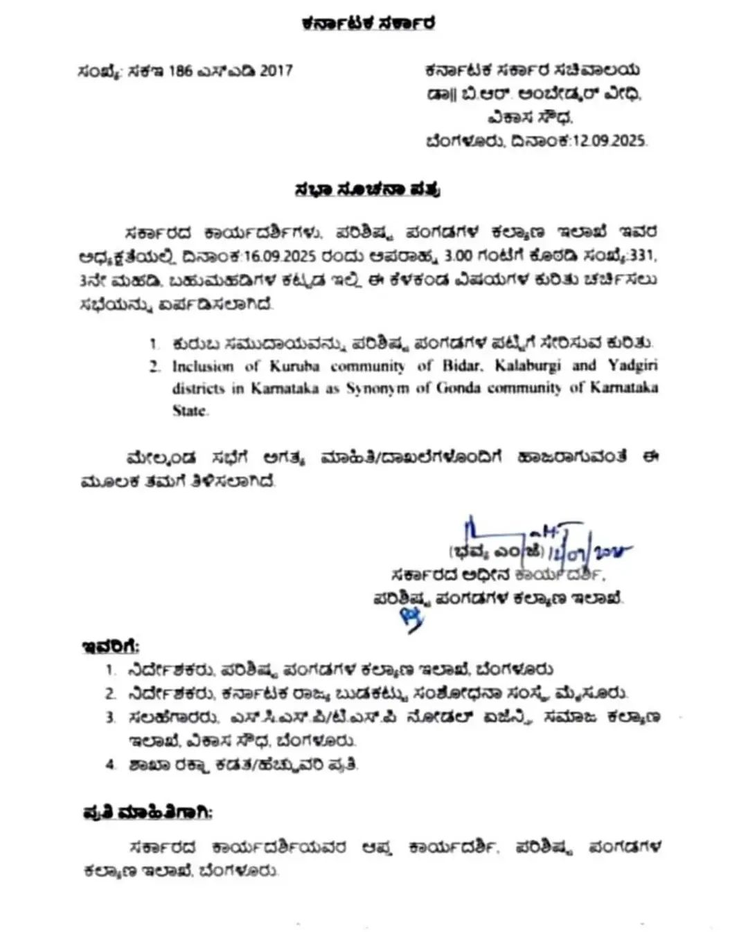 ಶಿವಮೊಗ್ಗ: ರಾಜ್ಯದ ಕುರುಬ ಸಮುದಾಯವನ್ನು ಪರಿಶಿಷ್ಟ ಪಂಗಡ (ಎಸ್.ಟಿ) ಪಟ್ಟಿಗೆ ಸೇರಿಸುವ ಪ್ರಕ್ರಿಯೆ ಮಹತ್ವದ ಹಂತ ತಲುಪಿದೆ. ಈ ಸಂಬಂಧ ರಾಜ್ಯ ಸರ್ಕಾರವು ನಾಳೆ, ಸೆಪ್ಟೆಂಬರ್ 16, 2025 ರಂದು ಪ್ರಮುಖ ಸಭೆ ಕರೆದಿದೆ. ಕುರುಬ ಸಮುದಾಯದ ಬಹುದಿನಗಳ ಬೇಡಿಕೆಗೆ ಮನ್ನಣೆ ನೀಡುವ ನಿಟ್ಟಿನಲ್ಲಿ ಸರ್ಕಾರ ಗಂಭೀರ ಹೆಜ್ಜೆ ಇಟ್ಟಿದೆ ಎಂದು ಹೇಳಲಾಗಿದೆ.